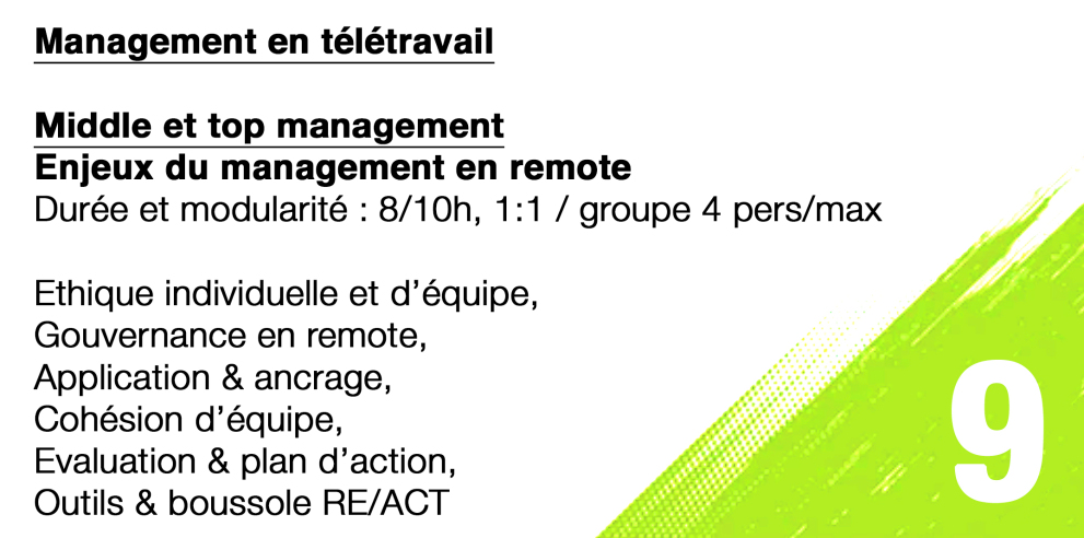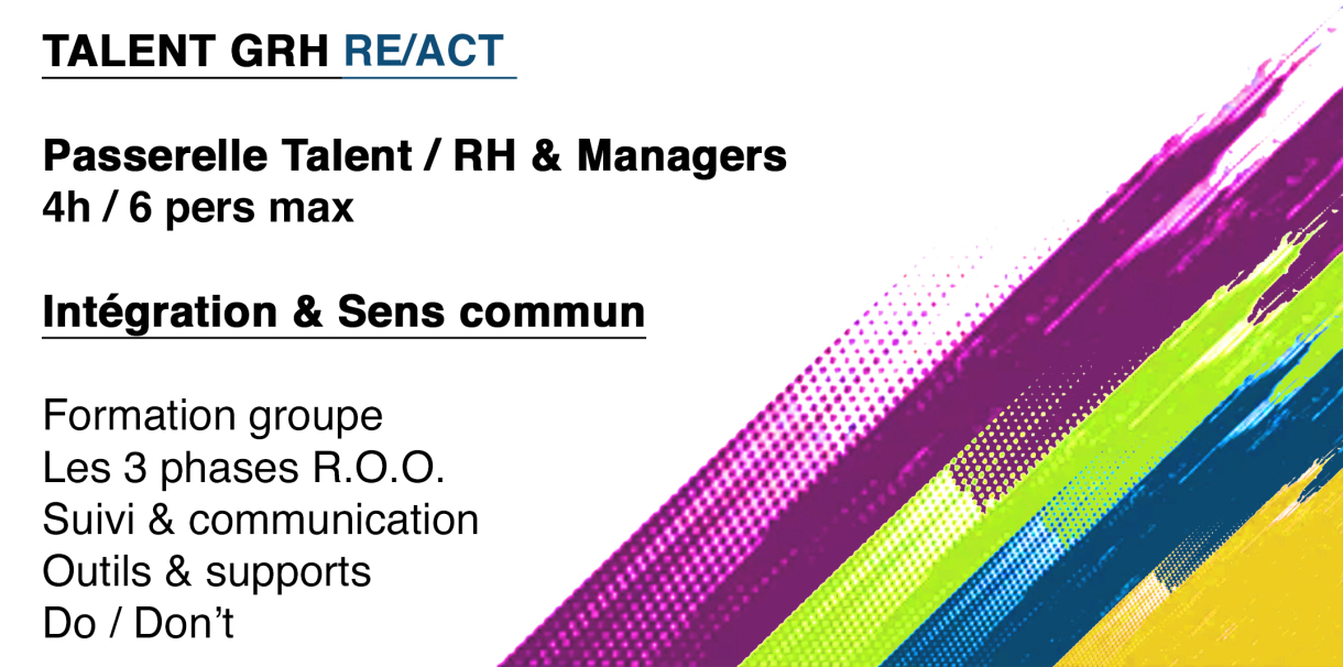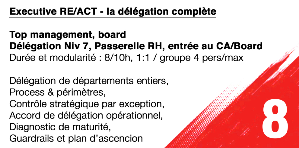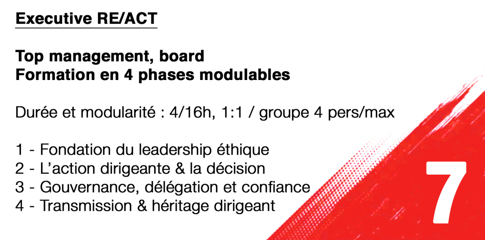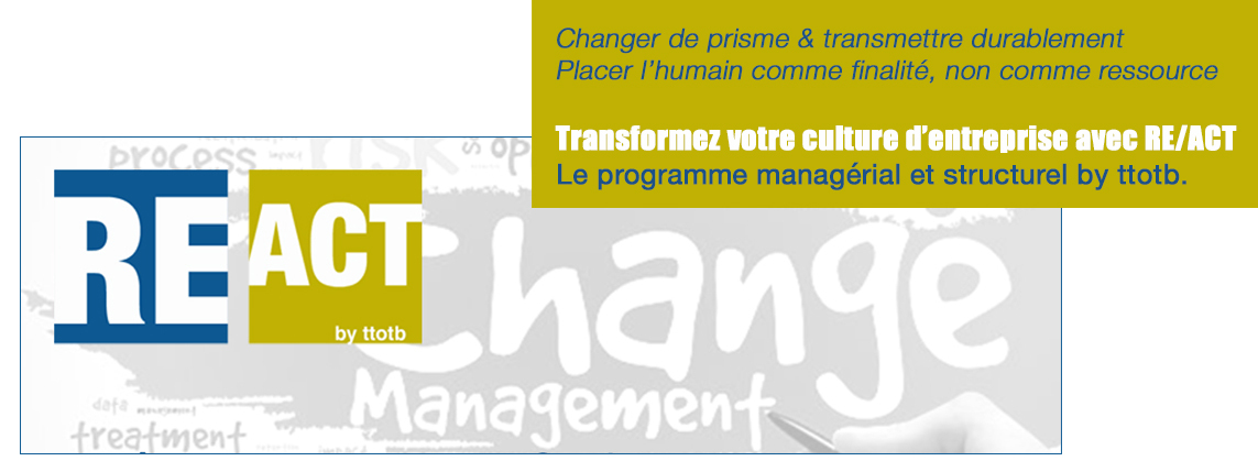 Elaborée sur ces 5 piliers, RE/ACT est une méthode novatrice conçue pour toutes les organisations souhaitant faire évoluer et structurer leurs pratiques relationnelles et managériales, clarifier les rôles, renforcer la confiance, impulser l’action juste et favoriser la transmission, en structuration comme en renforcement.